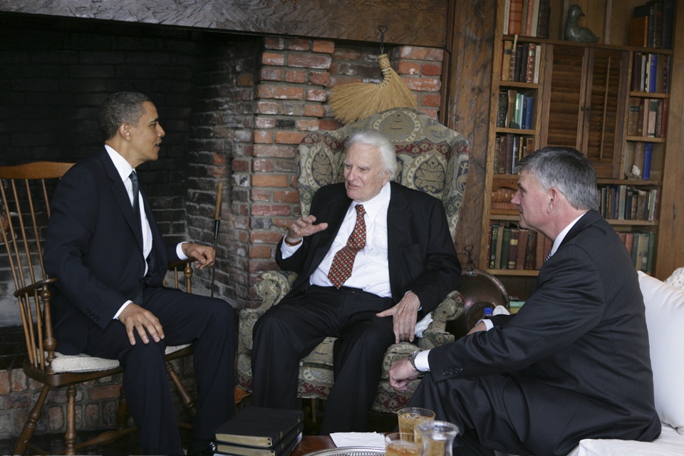 President Barack Obama with Billy Graham and his son, Franklin Graham. Image source.