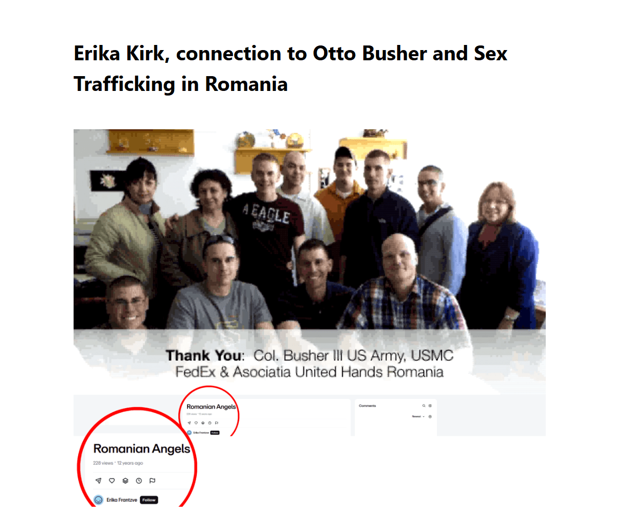 I found Erika’s Vimeo where she’s created a video about Romanian Angels. It’s mostly about giving gifts to kids– but she thanks Col. Otto Busher III US Army, USMC. Erika Kirk (known as Erika Frantzve at that time) thanks Otto Busher in the Romanian Angels video, where US military were allegedly bringing gifts to young orphans.