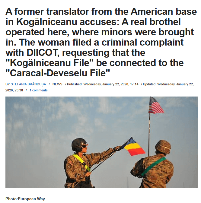 Journalist Ion Spânu presents in Cotidianul the revelations of a former translator at the American military base in Kogălniceanu. She is Ana Maria Nuciu, who claims that a real brothel operated in this military unit, where underage girls were brought here to satisfy the desires of some soldiers. Ana Maria Nuciu notified the Prosecutor’s Office about this brothel on the premises of the military base and, although there was an extensive investigation carried out by the American and Romanian authorities, the Agreement signed in 2001 between the two countries was invoked, in which Romania ceded the right of investigation of the American military to the USA.