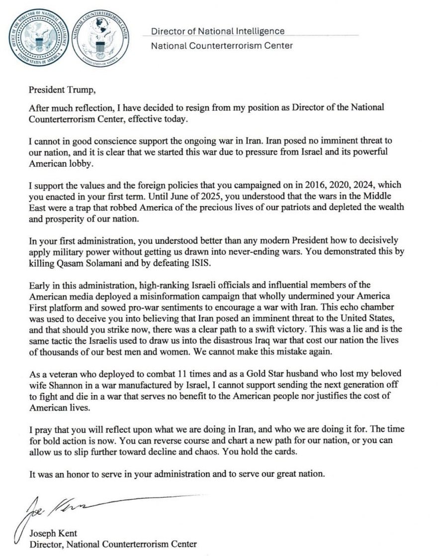 Joe Kent, the head of the National Counterterrorism Center and top aide to intelligence director Tulsi Gabbard, became the first senior Trump administration official to resign over the war in Iran. This was the headline news in the corporate media today.